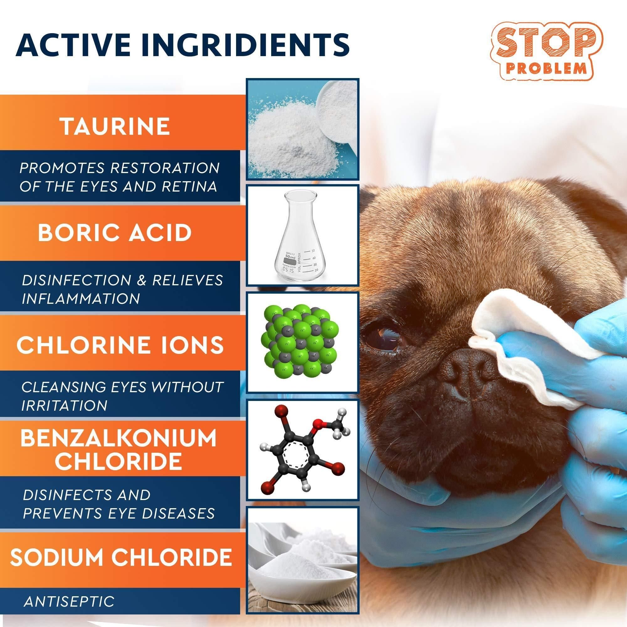 2.healing & skin softening: this cleaner is formulated with silver ions and panthenol to facilitate wound healing and skin softening, thereby ensuring vibrant and healthy skin. the presence of boric acid alleviates eyelid inflammation. it also contains taurine that stimulates pet eye restoration. it's a reliable option for preserving clear and healthy eyes, helping your dog see the world with feline-like clarity. it nourishes and promotes optimal eye health. pet-safe & effective: our new